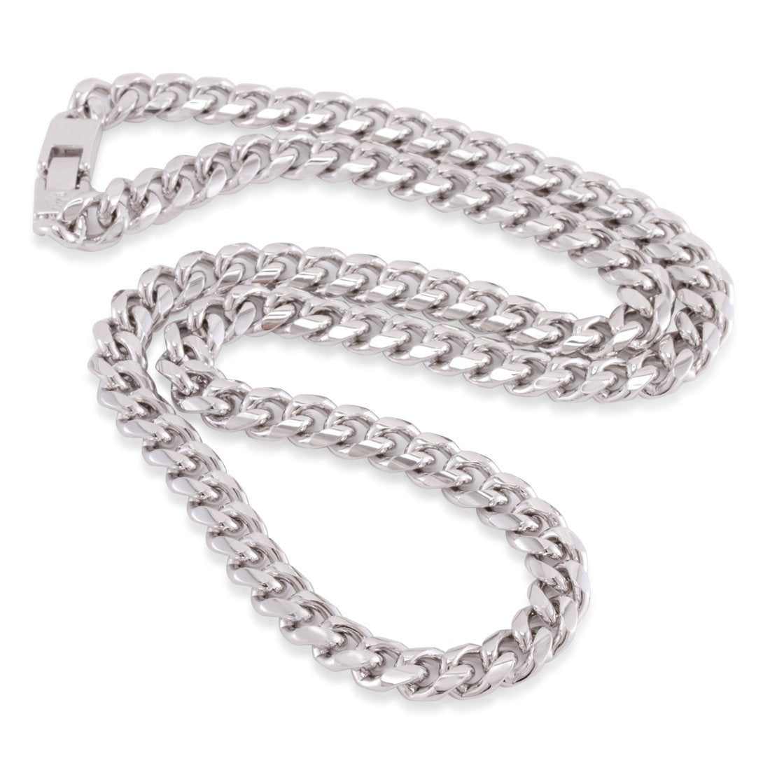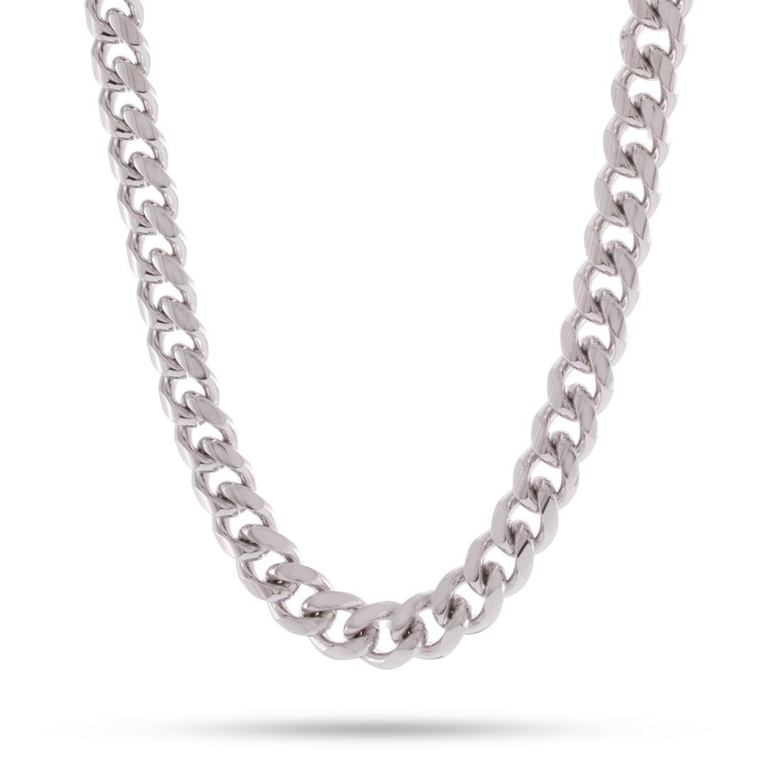 Made from solid stainless steel and finished with white gold plating, the Miami Cuban Curb chain has been a staple in the street wear industry. The 10mm thickness provides a sturdy, yet versatile look.