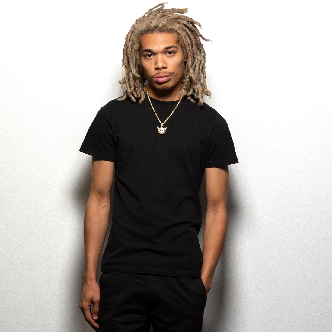 The classic devil emoji is now available as a stainless steel King Ice necklace. Plated with 14K Gold, each necklace is iced with colored round and trillion cut VVS Diamond Simulates to detail the infamous emoji expression. Each necklace comes with a 4mm, 20" Rope Chain.