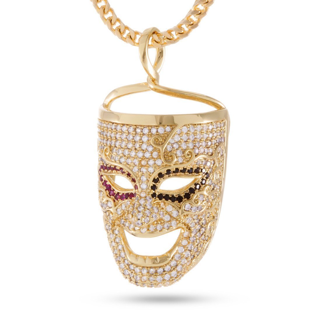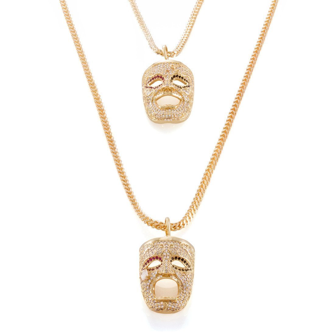 Taking its meaning from the Ancient Greek theater masks, the Laugh Now, Cry Later symbols continue as a popular idiom in pop-culture. Now, King Ice reimagines these iconic pieces into 14K Gold plated pieces. Each pendant uses AAA, handset stones to provide that classic look, while each set comes with 24” and 20” stainless steel Franco chain.