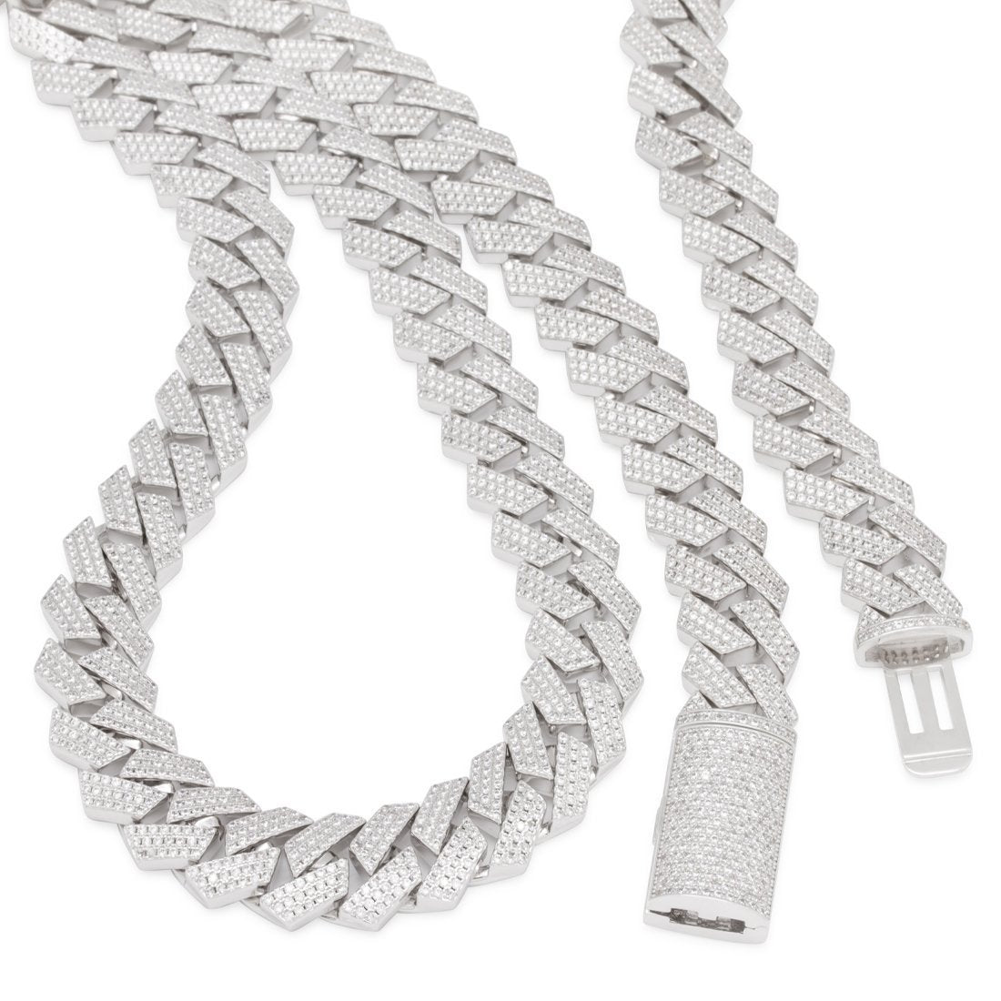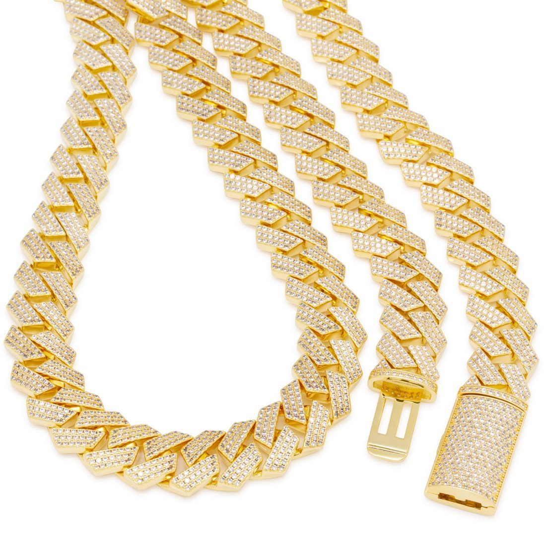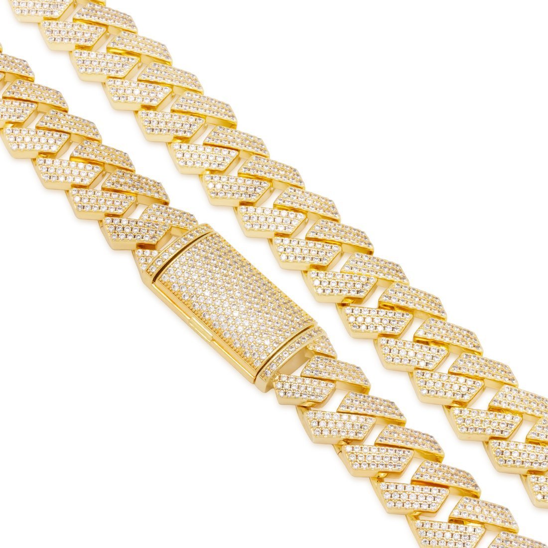 The new 18mm Diamond Cut Miami Cuban Chain features a straight, sharp link design. This chain and custom lock box is iced with more than 1,800 VVS Diamond Simulate stones. The chain is available in 14K Gold plating and white gold plating in various lengths.