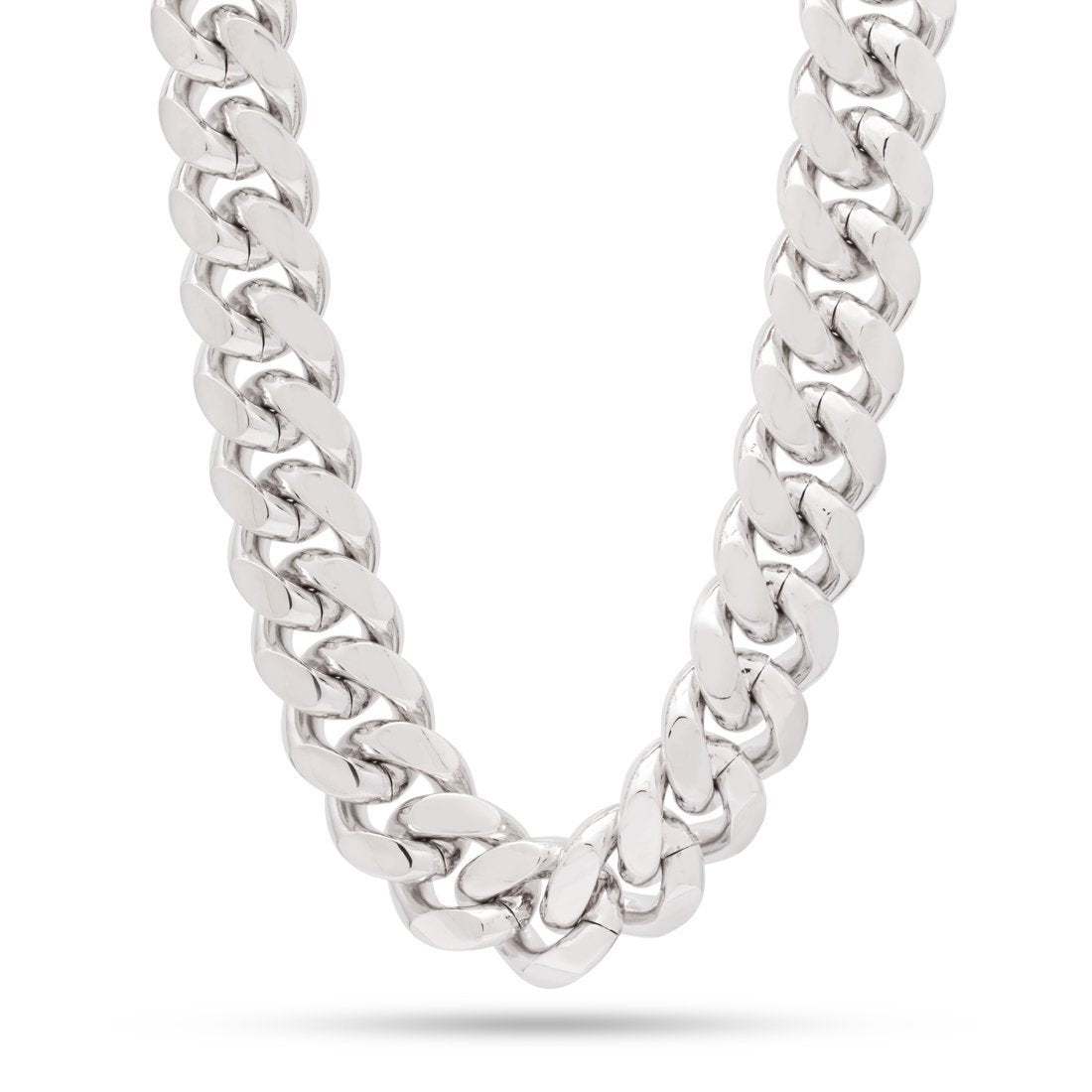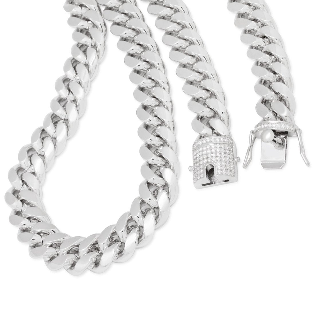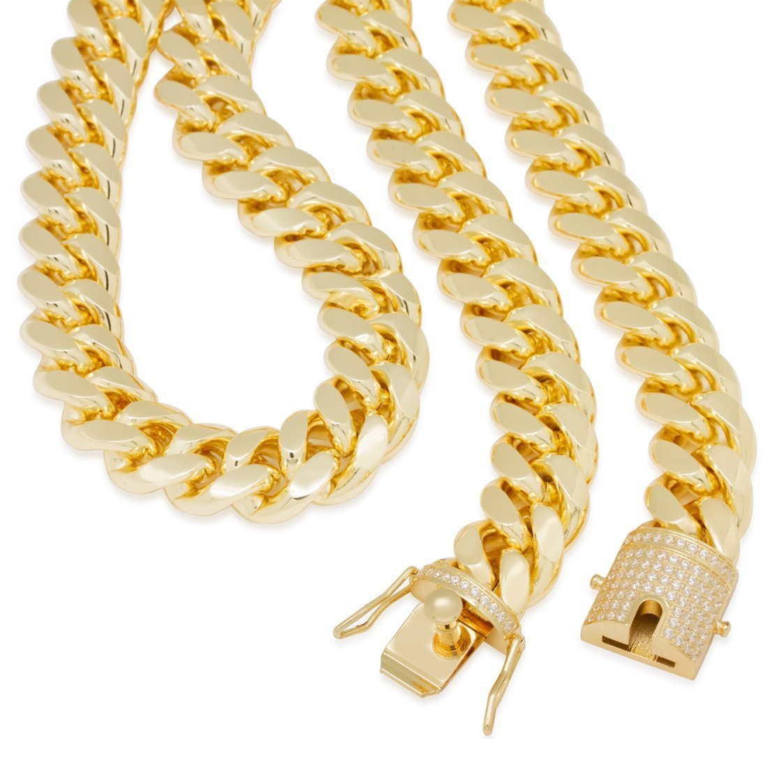 Made from stainless steel, the 18mm Miami Cuban Curb Chain provides that classic, thick link look. Available in 14K Gold plating and white gold plating, the chain has multiple lengths for different styles. The custom tongue box clasp is iced with bright handset CZ stones for a subtle finish.
