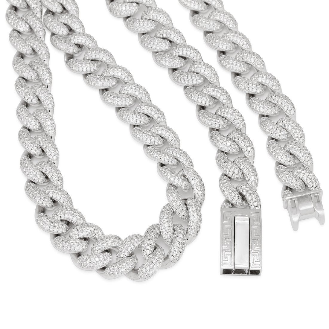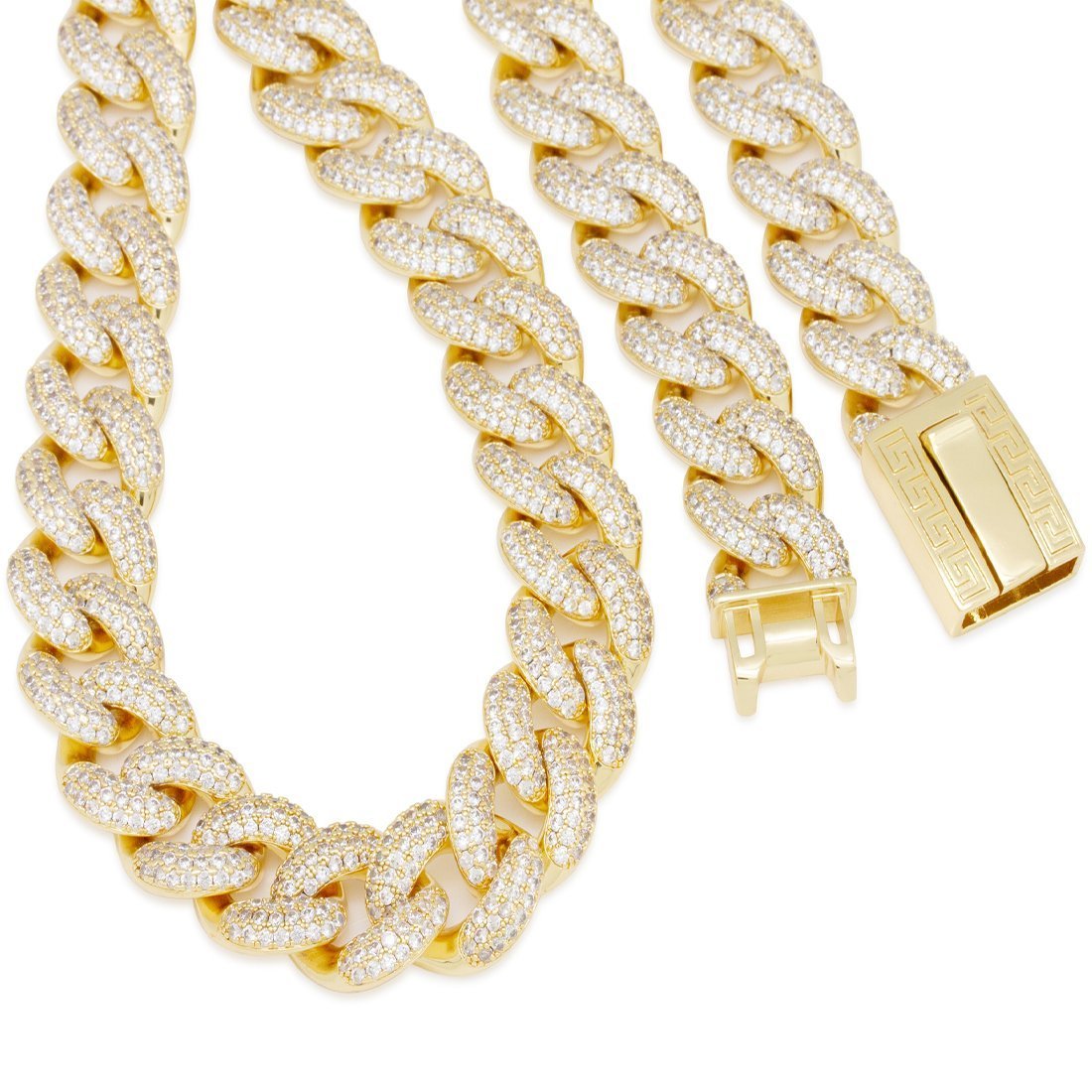 The classic King Ice Miami Cuban Chain is back. With endless CZ stones, the chain has a radiant look to it. Available in 14K Gold plating and white gold plating, the 20mm multi length chain matches perfectly with the bracelet. The chain comes with a custom Greek Key push down clasp for a secure and comfortable wear.