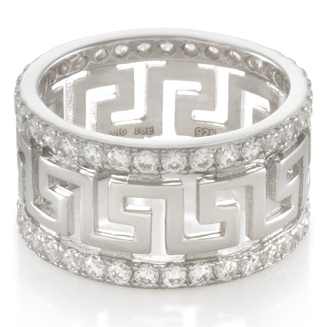 Symbolizing the flow of time and eternity, the .925 Sterling Silver Greek Key Ring provides a vibrant display of craftsmanship and quality. Each ring is made from .925 Sterling Silver and features handset VVS Diamond Simulate stones.