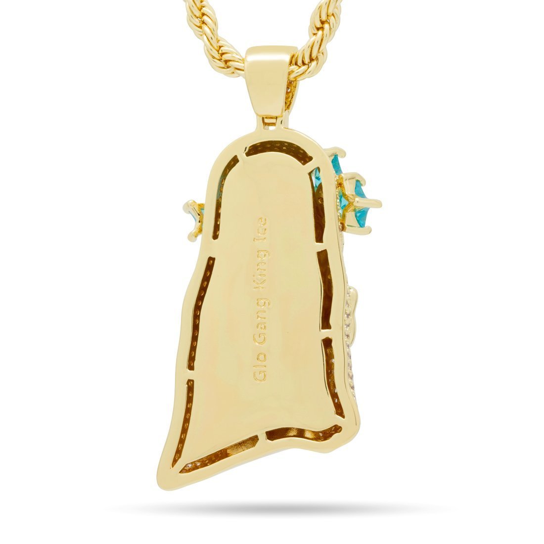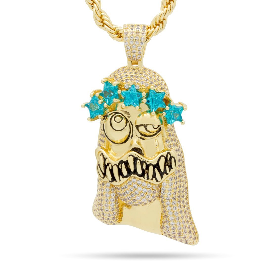 Uniquely iced with bold teeth and a distinct crown of five turquoise VVS Diamond Simulates, the Glo God pendant is available in 14K Gold plating and white gold plating. Each piece is paired with a 4mm, 20" stainless steel Rope chain.