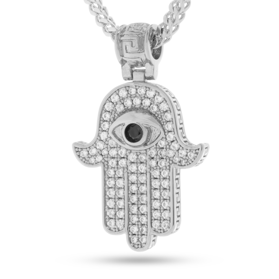 Hamsa, meaning five digits, has offered protection from the evil eye for generations, and this symbolic gesture of the open right hand has even said to have brought luck to those who wear it. Each piece features white gold plating to offer added shine and protection, while the clear, CZ stones provide value and elegance to this one-of-kind piece. Meanwhile, its 20", 2.5mm stainless steel Franco provides the perfect look for those looking for protection.