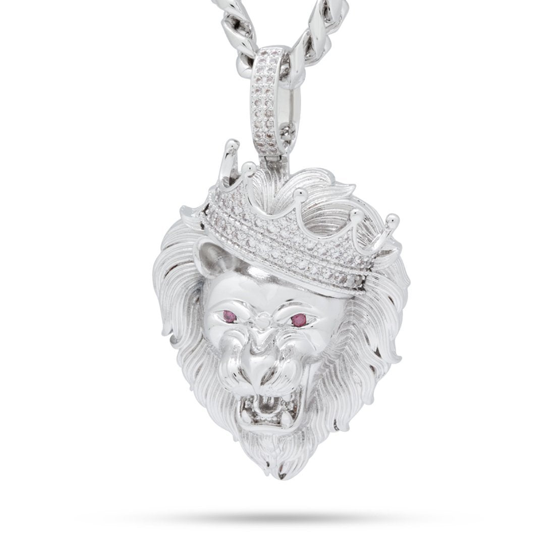 Check out this new silver plated roaring lion CZ necklace. Features a high polished finish encrusted with micro white CZ stones that have been hand set on a micro pave setting. It measures 2 1/2" H x 1 1/2" W. King Ice engraved at the back of the pendant. It includes a 20" 8mm stainless steel miami cuban chain.