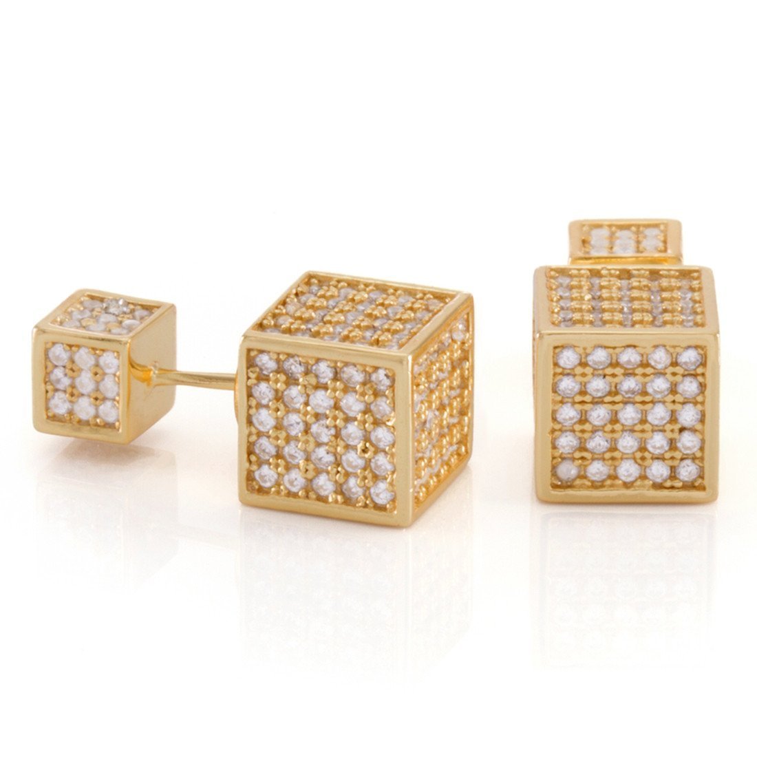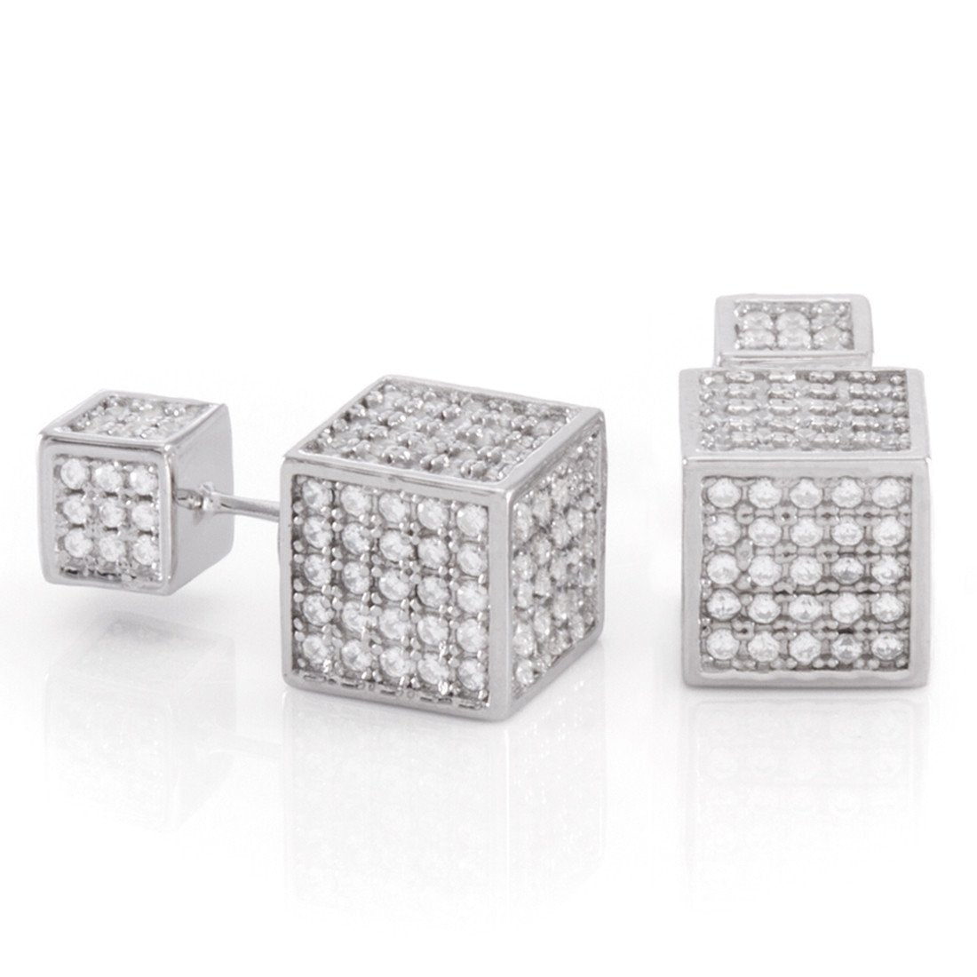 Our Sterling Silver Cubist Earrings provide a large, elegant look. Each .925 Sterling Silver piece is available in genuine 14K gold plating or white gold plating, iced with handset VVS Diamond Simulate stones to create its iconic look.