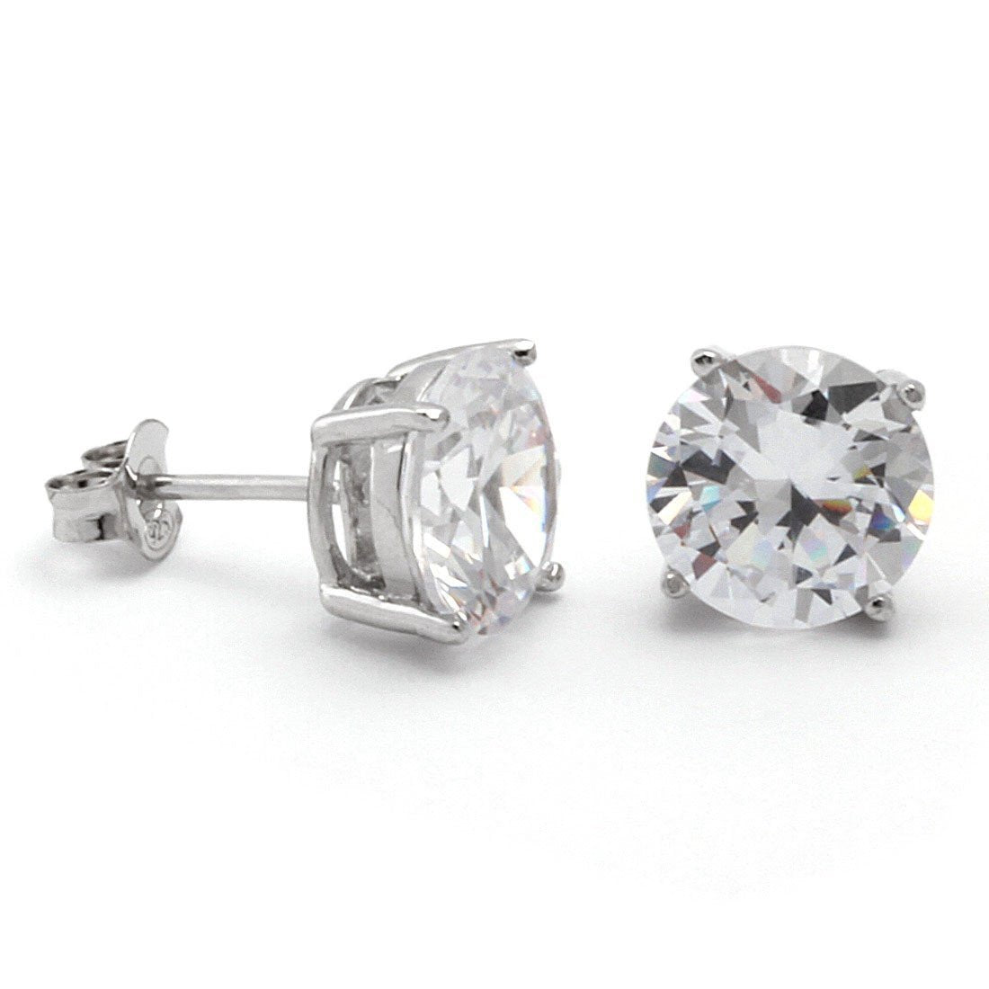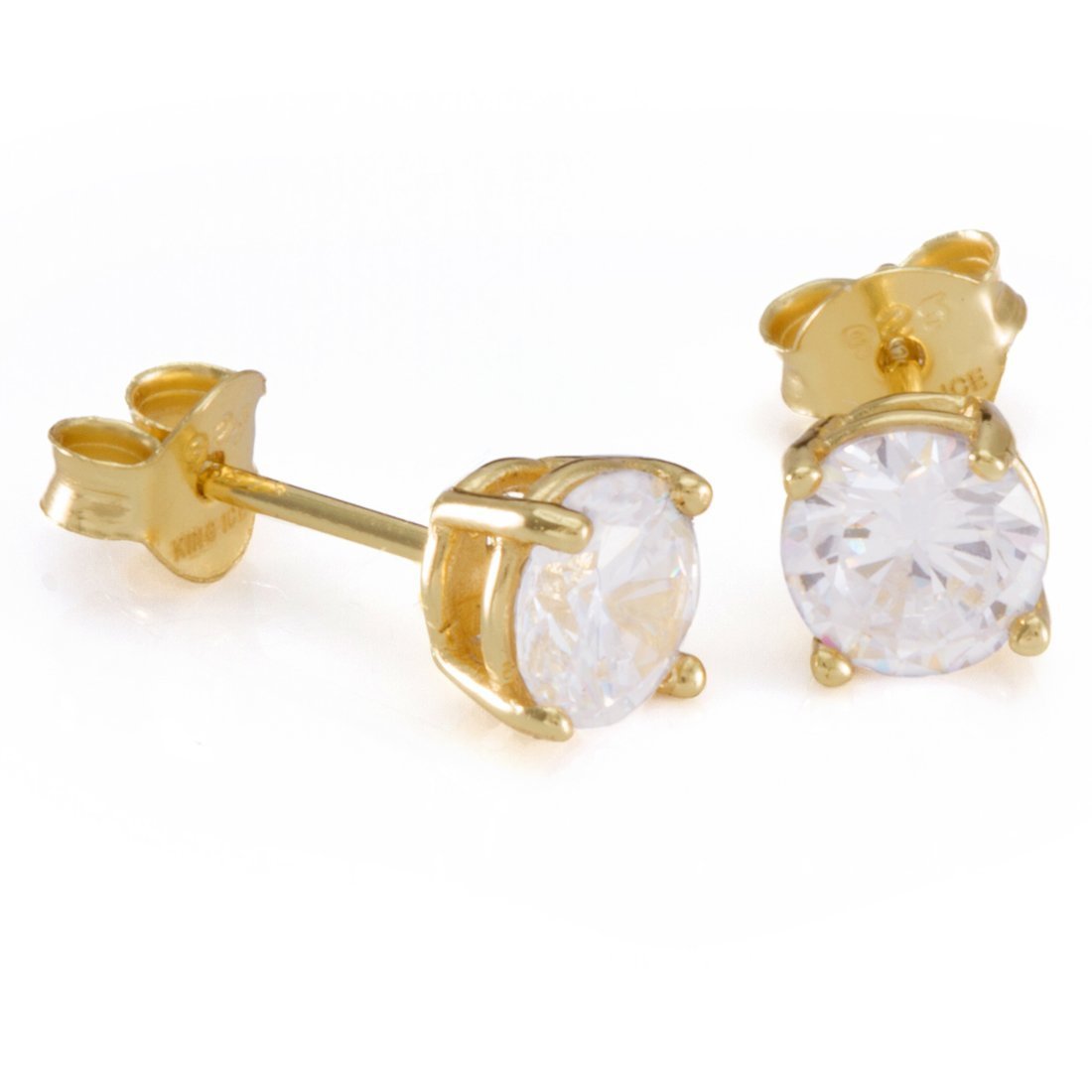 This pair features .925 Sterling Silver casting studs available plated in 14K Gold or White Gold. The four prong set with clear round cut CZ stones are secured with butterfly backings for an easy, comfortable wear.