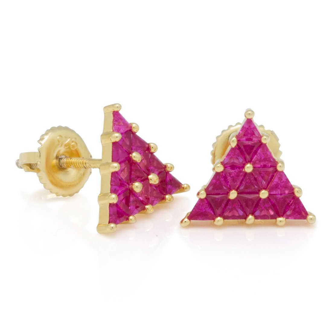A symbol of geometric perfection, the Trinus takes its inspiration from the All-Seeing Eye. Each pair of .925 Sterling Silver earrings uses trilliant cut ruby handset CZ stones to create its aura of light. The 14K Gold plating adds a bright finish. The screwback posts provide a sturdy, stable placement and wear.