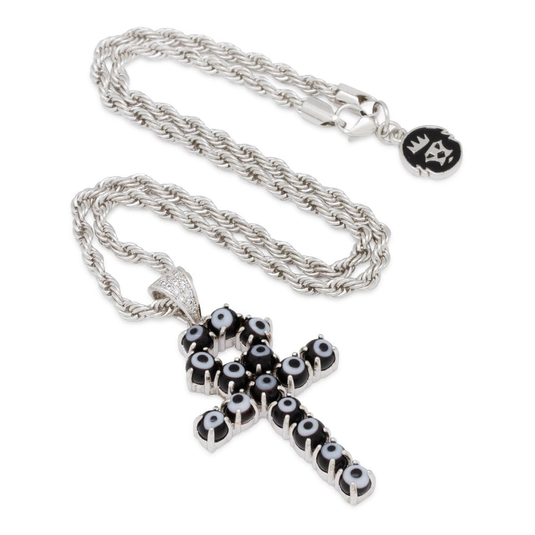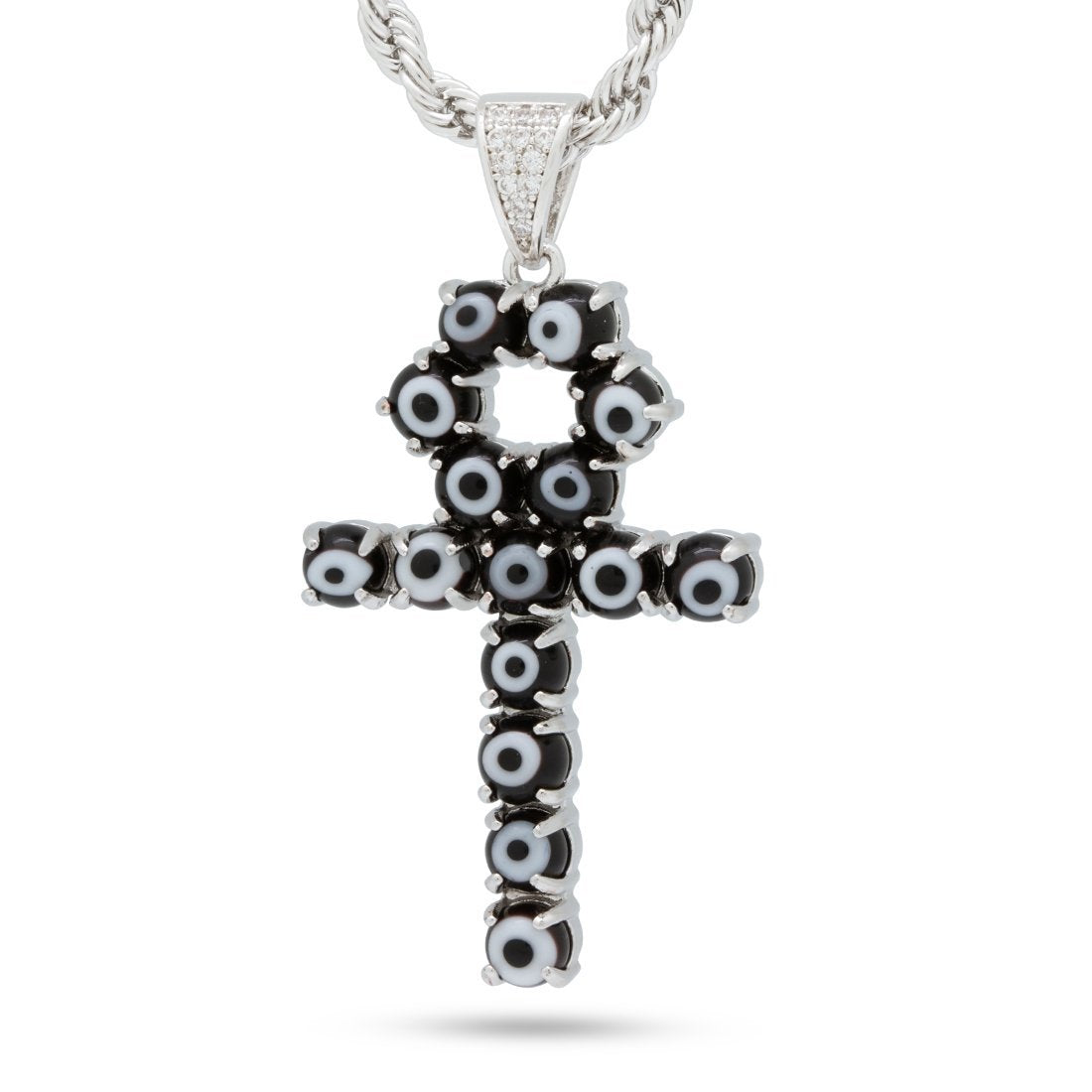 Combining the Ankh Cross and Evil Eyes symbolizes the beauty of life and offers protection from all harm. Each unique design provides a vibrant display of black evil eye beads and white gold plating that sets the standard for street wear jewelry. Each piece is paired with a 4mm, 20" Rope Chain.