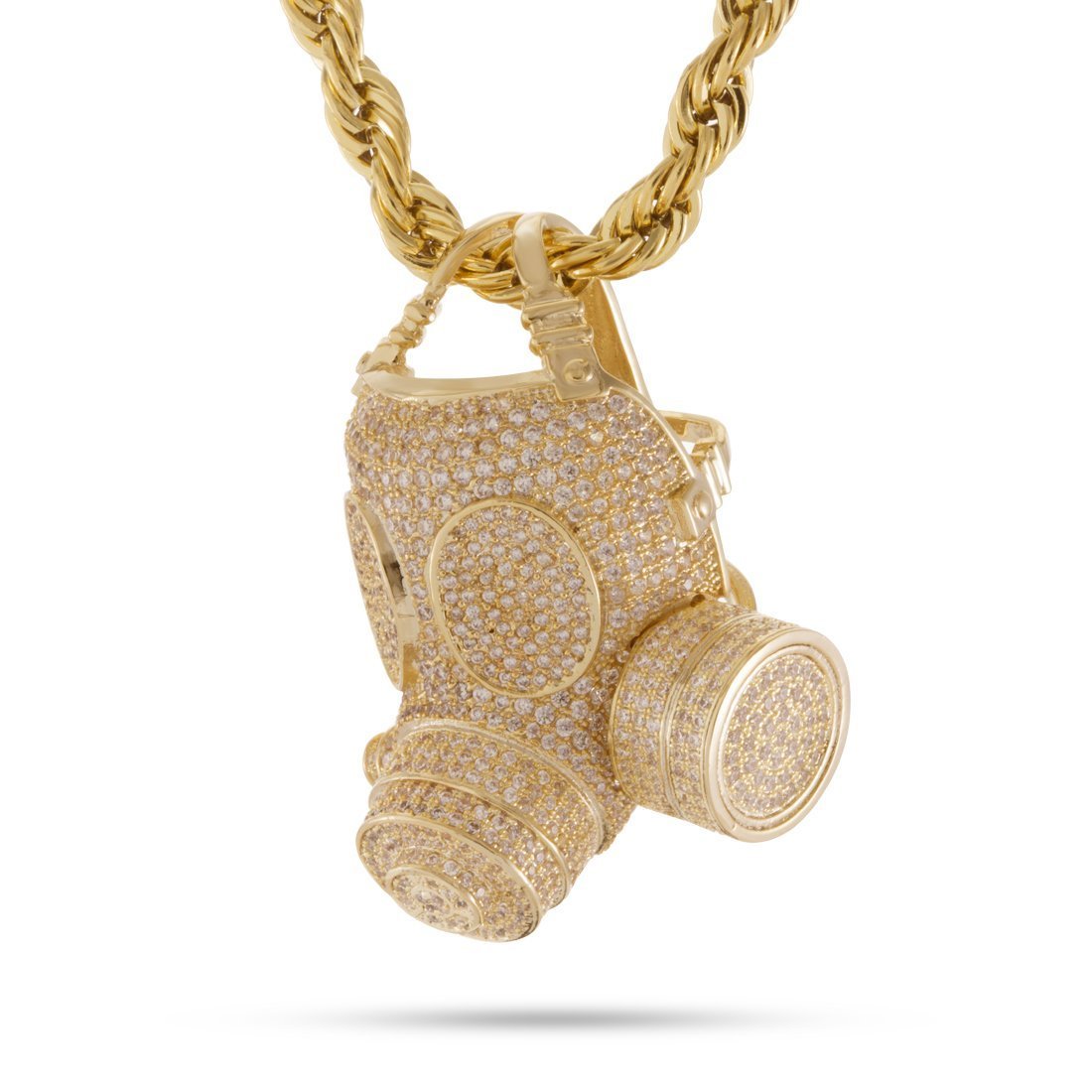 Made to combat smoke and chemical attacks, the Gas Mask provides an iconic look to one of the most helpful tactical tools in the world. Made from 14K gold plating and lined with AAA, handset stone, the Gas Mask features over 200 handset stones and includes a 4 mm, 24” stainless steel rope chain for men.
