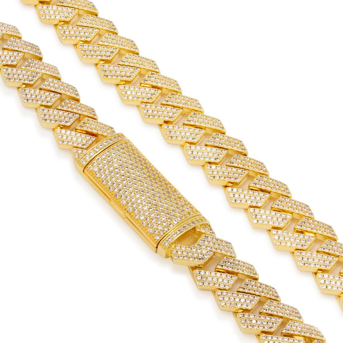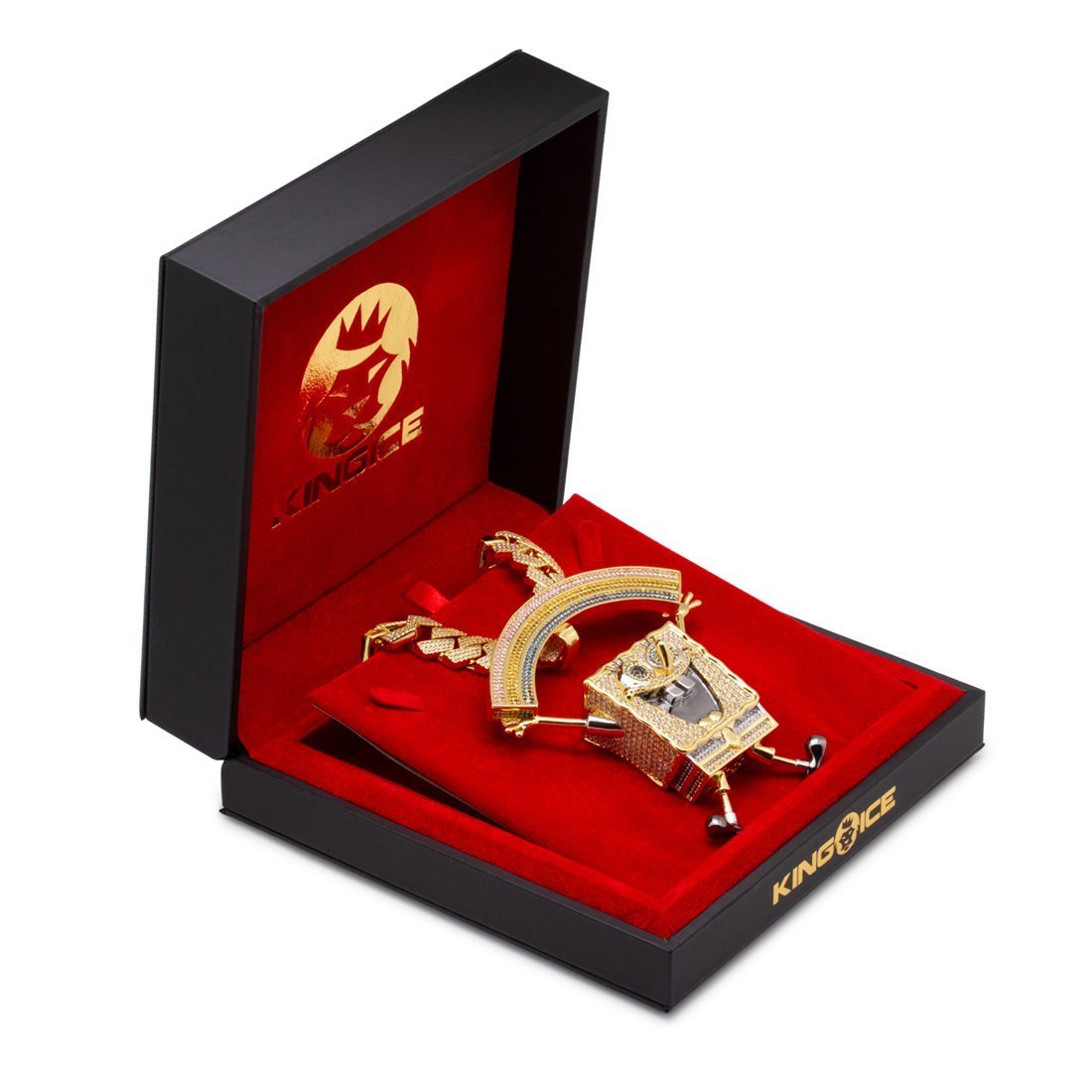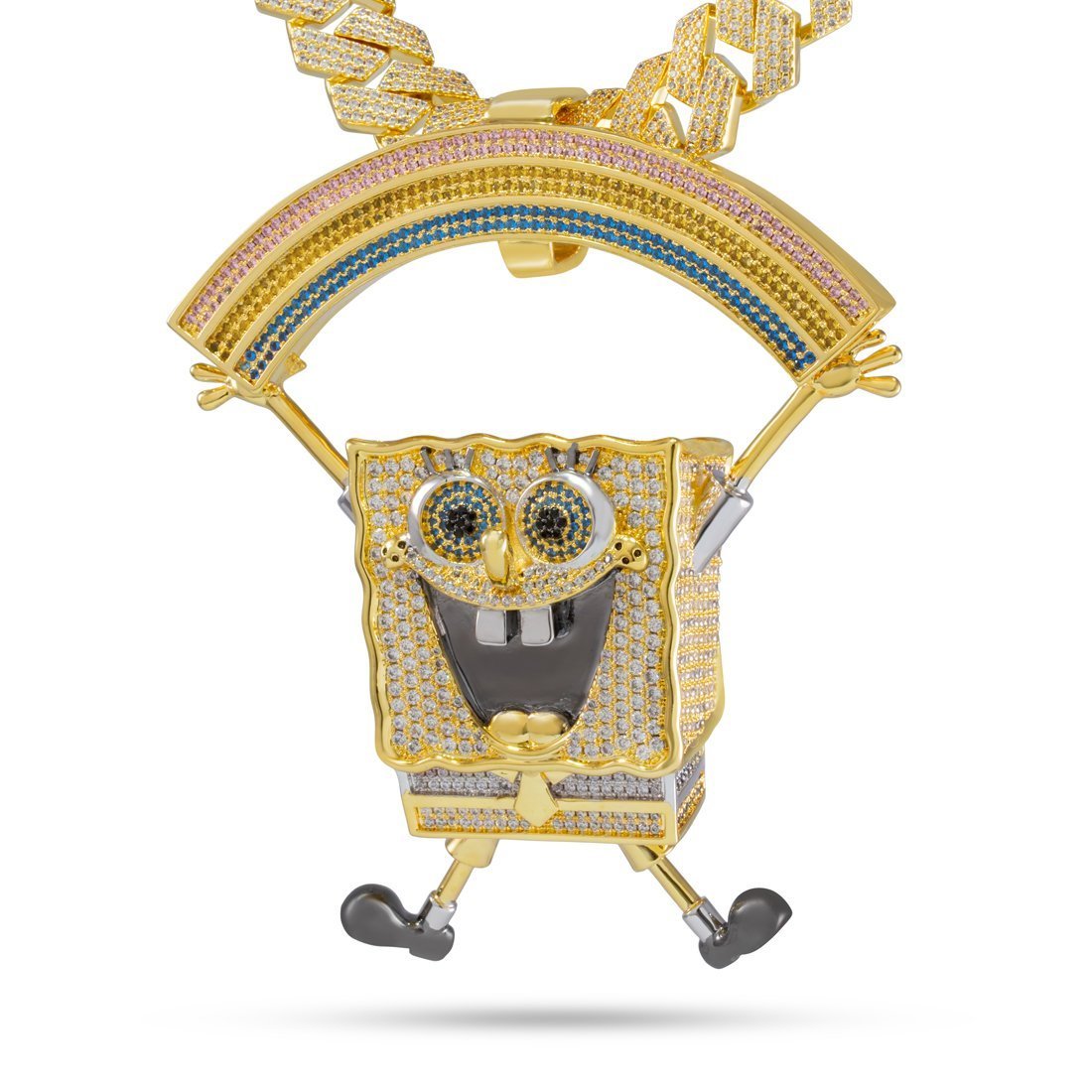 A 3D SpongeBob is iced with more than 1,000 clear handset CZ stones that cover his entire body. Over 400 pink, aquamarine and yellow stones decorate the rainbow that SpongeBob holds up while onyx and blue stones highlight his large, round eyes. The pendant is dipped and plated five times in 14K Gold. White gold and black gold detail the rest of his clothing. The pendant is paired with an iced 18mm, 24" Miami Cuban Chain. The chain comes with a special double safety lock box clasp with an insert tab for a secure wear. The clasp provides safety for this heavy set piece.