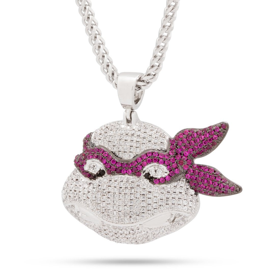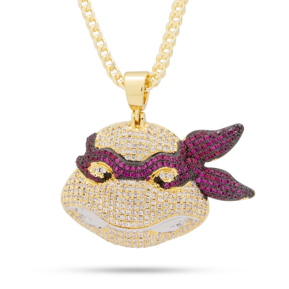 Because of his angry and aggressive nature, Ralph always butted heads with his oldest brother Leo. But despite that, he always has love for his family and defends them at all costs against Shredder and the Foot Clan. Each Raphael necklace includes clear and his signature red color stones to capture his iconic look. The one of a kind pendant is available in 14K Gold plating and white gold plating. Each official Teenage Mutant Ninja Turtles necklace includes a 2.5mm, 20" Stainless Steel Franco Chain.