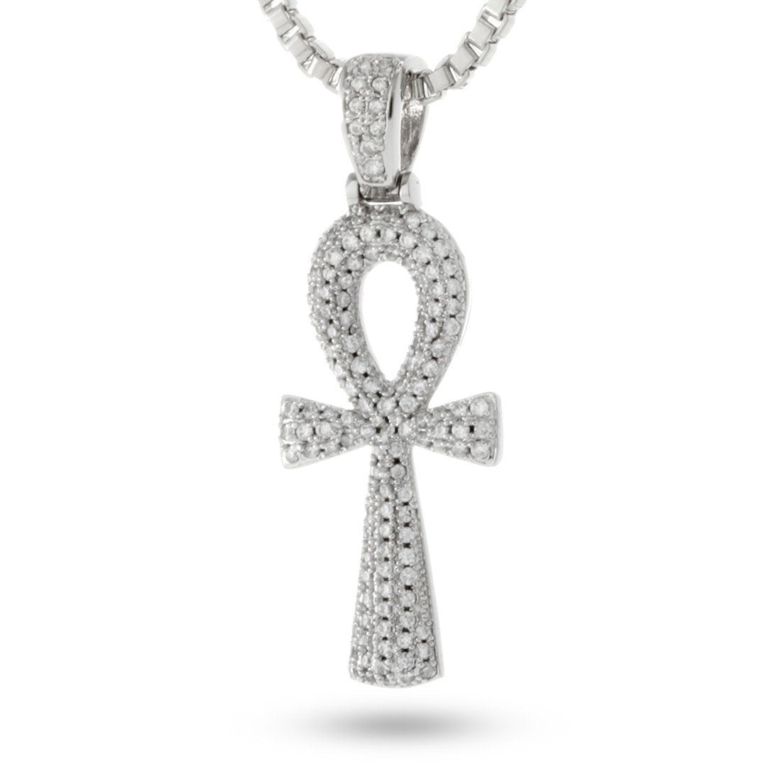 The ancient Egyptian character of life, the Ankh Cross now comes plated in white gold and lined with AAA, handset stones to provides a new twist on this fan favorite. From it's decadent stone placement to it's dual-sided lapis azul stone, the Ankh cross radiates in any light, and with 26", 2.5mm stainless steel Franco chain, you'll get the perfect fit for any occasion.