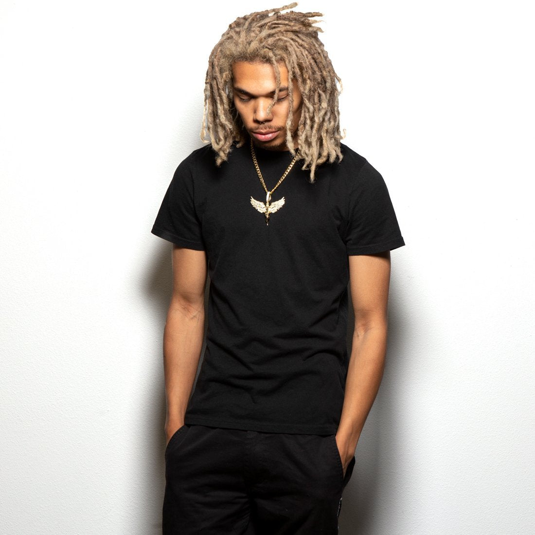 The Soaring Angel spreads its wings to take flight, elevating your game to new levels with its shine. Available in 14K Gold plating and white gold plating, the piece displays the fine details of its wings, body and robe, while the clear VVS Diamond Simulates cover the interior of the wings. Each necklace comes with a matching 8mm, 24" Miami Cuban Chain.